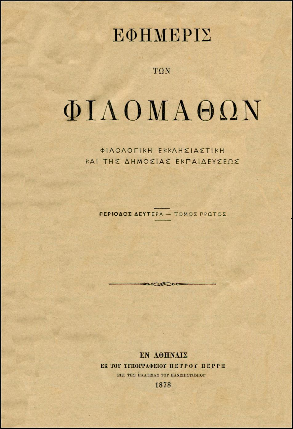 ΕΦΗΜΕΡΙΣ ΤΩΝ ΦΙΛΟΜΑΘΩΝ, φιλολογική, εκκλησιαστική και της δημόσιας εκπαιδεύσεως. Περίοδος Β', τόμοι Α', Β', Γ', 1877-1880. Τόμος Α' : τεύχος 1ο 1/4/1877 εώς 24ο 15/3/1878, σελ. δ΄+396+12 (στα τεύχη 1,2,4 με παράρτημα 4 σελίδων). Τόμος Β': τεύχος 1ο 1/4/1878 εώς 24ο 15/3/1879, σελ. Η΄+384. Τόμος Γ': τεύχος 1ο 1/4/1879 εώς 24ο 15/3/1880, σελ. Η΄+384. Εν Αθήναις 1877-1880, 8ο (24x17 εκ.). Συντάκται: Κοντός Κ.Σ., Πανταζής Δ., Πετρής Ν., Σακελλαρόπουλος Σ.Κ., Βάσης Σπ., Πατσόπουλος Δ., Φρεδερίκος Οθ., Φρεδερίκος Κ., Δραγάτσης Ιάκ., Κονδύλης Δ.Α., Παπαϊωάννου Πλ., Σταματέλος Ι.Ν., Κυριακόπουλος Δ.Ν., Κουπιτώρης Π., Πούλιος Χαρίσης, Κοφινιώτης Ι. (βιβλιοδεσία με δερμάτινη ράχη).