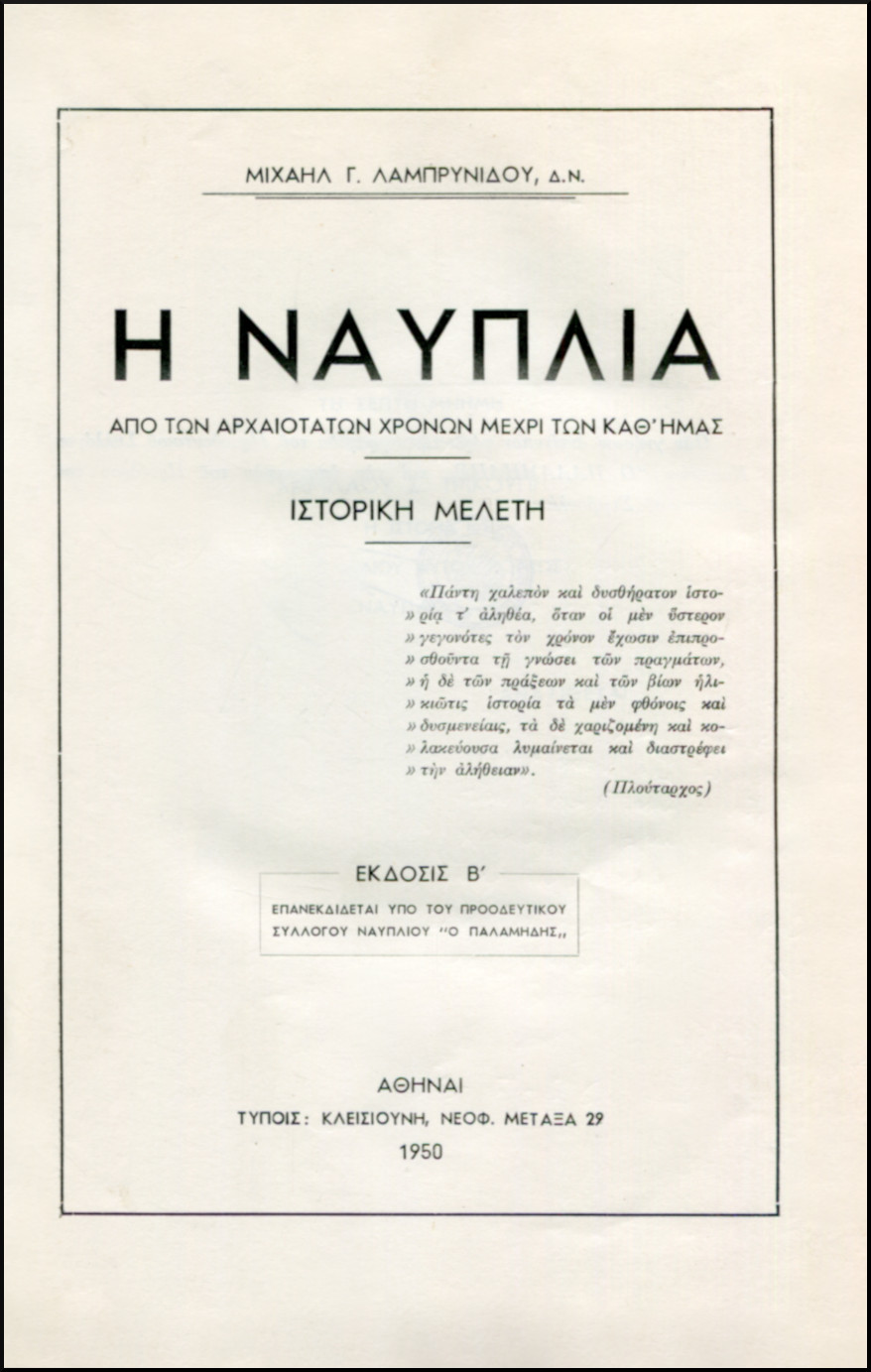 ΛΑΜΠΡΥΝΙΔΗΣ ΜΙΧΑΗΛ Γ., Η ΝΑΥΠΛΙΑ ΑΠΟ ΤΩΝ ΑΡΧΑΙΟΤΑΤΩΝ ΧΡΟΝΩΝ ΜΕΧΡΙ ΤΩΝ ΚΑΘ' ΗΜΑΣ, ΙΣΤΟΡΙΚΗ ΜΕΛΕΤΗ. ΕΚΔΟΣΙΣ Β΄. ΑΘΗΝΑΙ 1950, 24x17 εκ., σελ. 352+εικόνες (Ιδιωτική βιβλιοδεσία, με δερμάτινη ράχη)