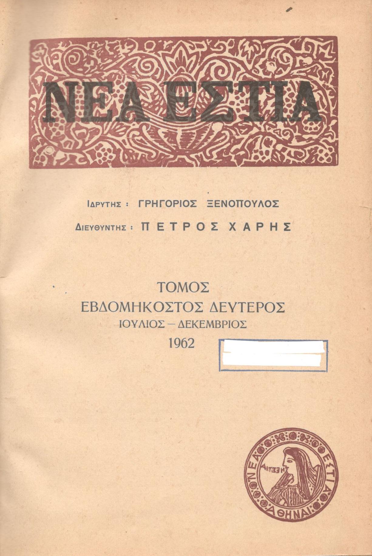 ΝΕΑ ΕΣΤΙΑ, ΛΟΓΟΤΕΧΝΙΚΟ ΠΕΡΙΟΔΙΚΟ. ΙΔΡΥΤΗΣ: ΓΡΗΓΟΡΗΣ ΞΕΝΟΠΟΥΛΟΣ, ΔΙΕΥΘΥΝΤΗΣ: ΠΕΤΡΟΣ ΧΑΡΗΣ. ΕΤΟΣ 1962, ΤΟΜΟΣ ΟΒ', ΤΕΥΧΗ 840-851 (ΙΔΙΩΤΙΚΟ ΔΕΣΙΜΟ ΠΡΑΣΙΝΟΥ ΧΡΩΜΑΤΟΣ)