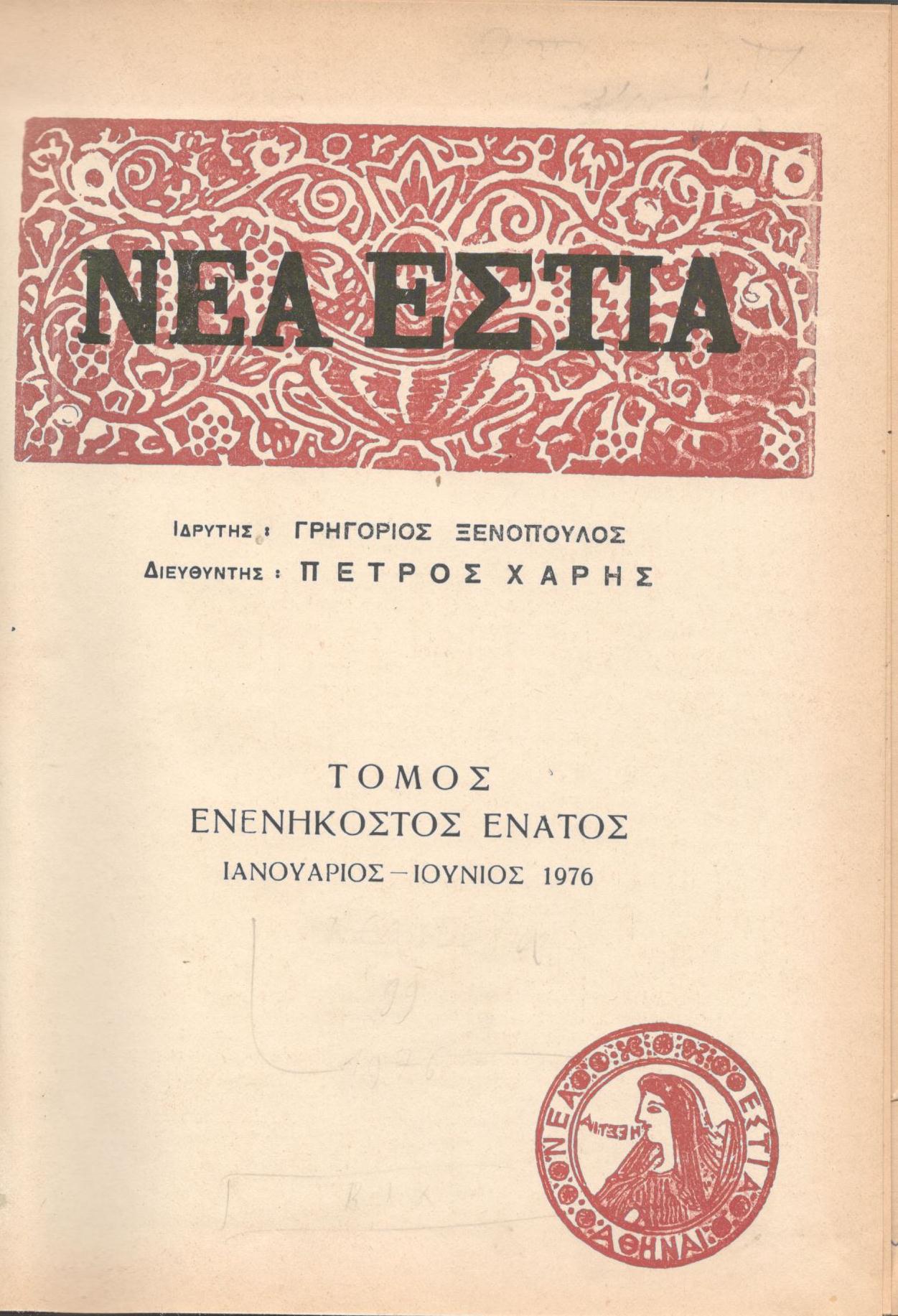 ΝΕΑ ΕΣΤΙΑ, ΛΟΓΟΤΕΧΝΙΚΟ ΠΕΡΙΟΔΙΚΟ. ΙΔΡΥΤΗΣ: ΓΡΗΓΟΡΗΣ ΞΕΝΟΠΟΥΛΟΣ, ΔΙΕΥΘΥΝΤΗΣ: ΠΕΤΡΟΣ ΧΑΡΗΣ. ΕΤΟΣ 1976, ΤΟΜΟΣ 99, ΤΕΥΧΗ 1164-1175 (ΙΔΙΩΤΙΚΟ ΔΕΣΙΜΟ ΠΡΑΣΙΝΟΥ ΧΡΩΜΑΤΟΣ)