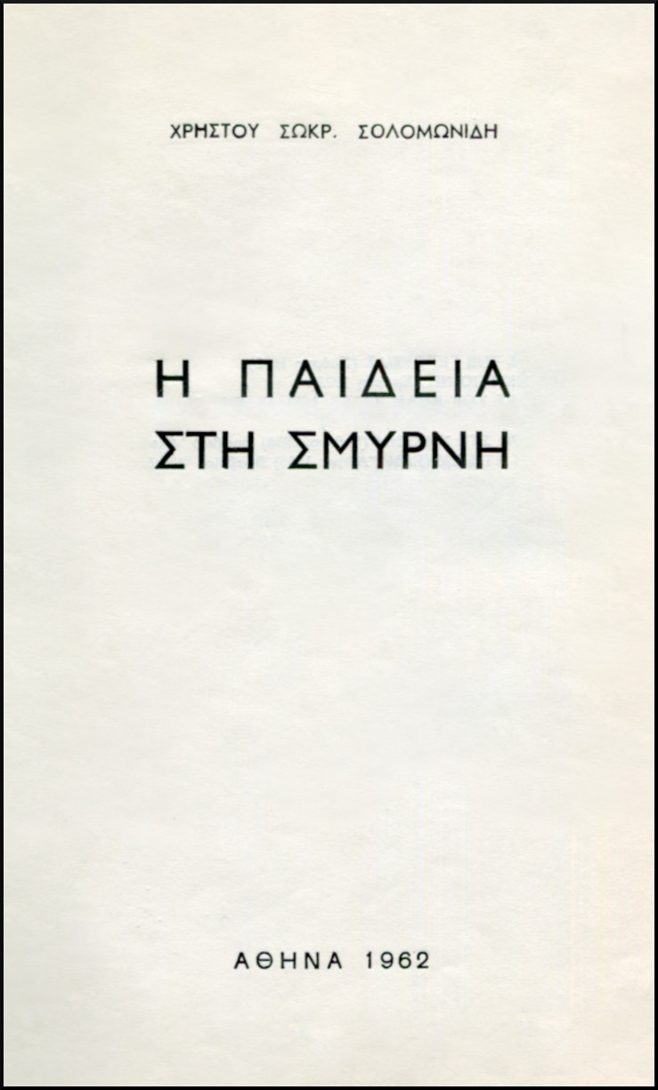 ΣΟΛΟΜΩΝΙΔΗΣ ΧΡΗΣΤΟΣ ΣΩΚΡ., Η ΠΑΙΔΕΙΑ ΣΤΗ ΣΜΥΡΝΗ. ΑΘΗΝΑΙ 1962, 21x15, σελ. 430+2χ.α. (αντίτυπο δερματόδετο σε καλή κατάσταση, στην αρχή λείπει ψευδότιτλος;+λευκή)