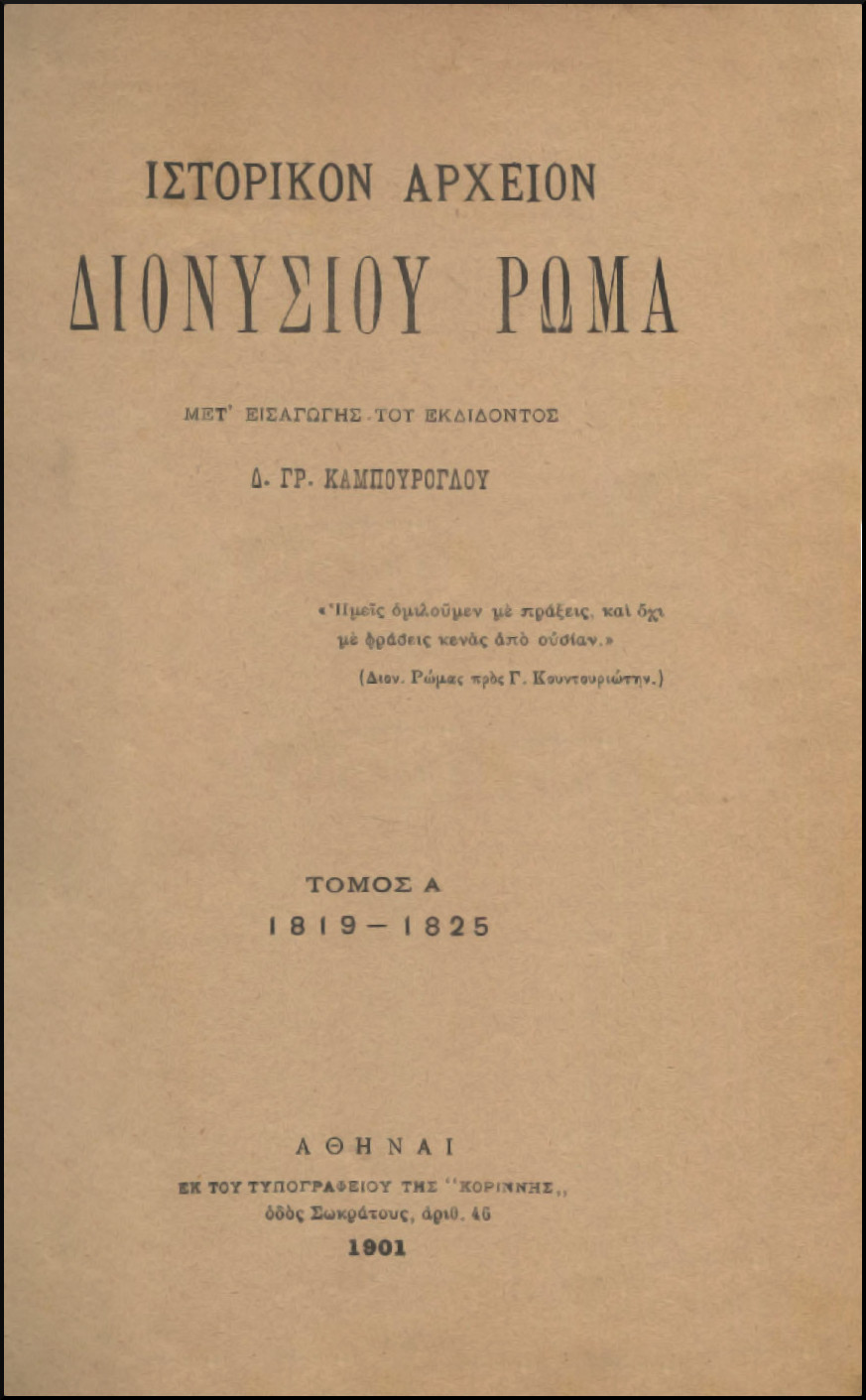 ΡΩΜΑΣ ΔΙΟΝΥΣΙΟΣ, ΙΣΤΟΡΙΚΟΝ ΑΡΧΕΙΟΝ ΔΙΟΝΥΣΙΟΥ ΡΩΜΑ, ΤΟΜΟΙ Α+Β. ΜΕΤ' ΕΙΣΑΓΩΓΗΣ Δ. ΓΡ. ΚΑΜΠΟΥΡΟΓΛΟΥ. ΤΟΜΟΣ Α΄ 1819-1825 - ΤΟΜΟΣ Β΄ 1826. ΑΘΗΝΑΙ 1901-1906, 25x18, σελ. πη΄+820+κβ'+770 (αντίτυπο σε πολύ καλή κατάσταση, εκτός από 3-4 σελίδες στο τέλος του Α΄ τόμου [817-820] περιεχόμενα που είναι ταλαιπωρημένες, ιδιωτική βιβλιοδεσία, δερμάτινη ράχη)